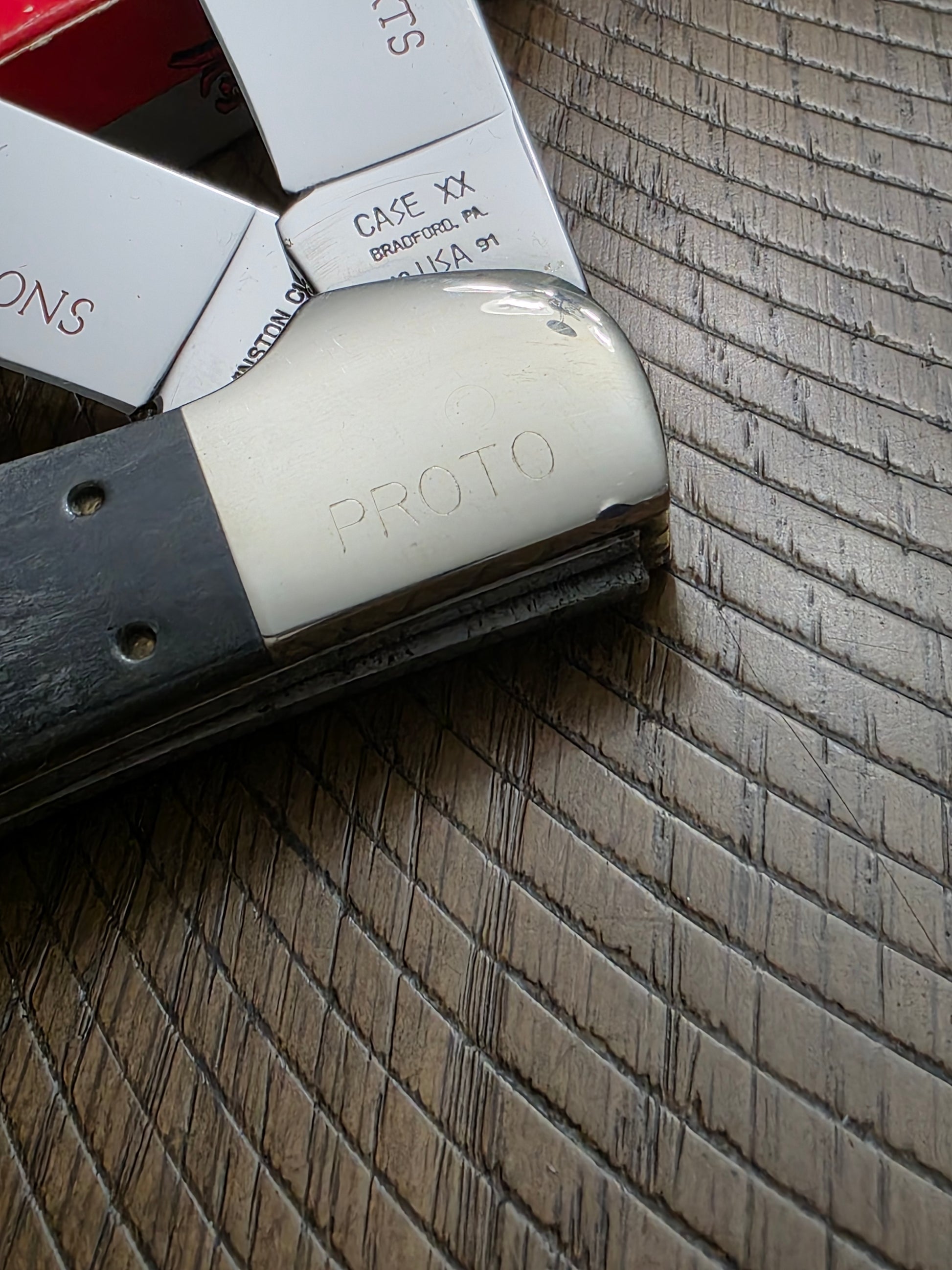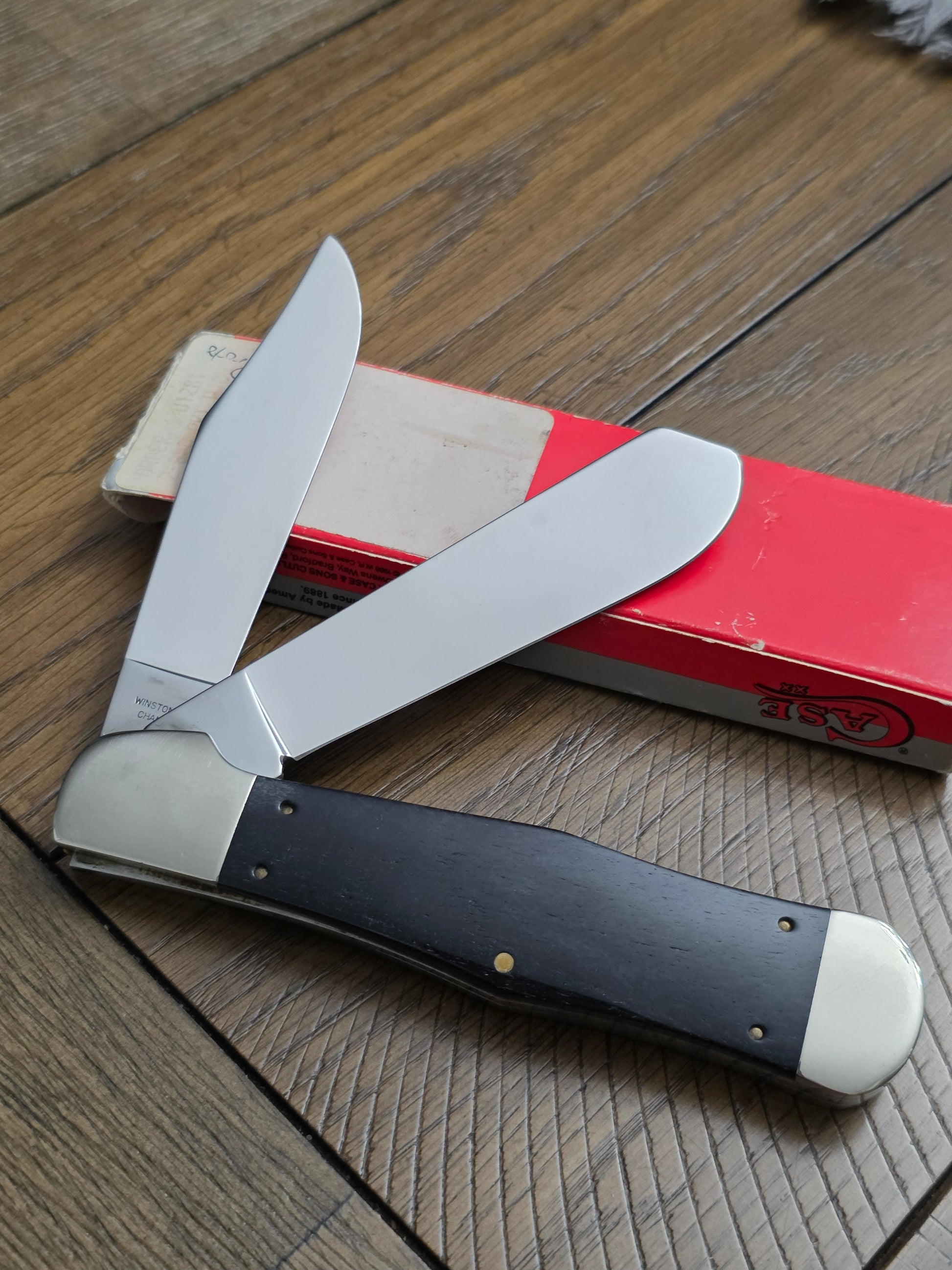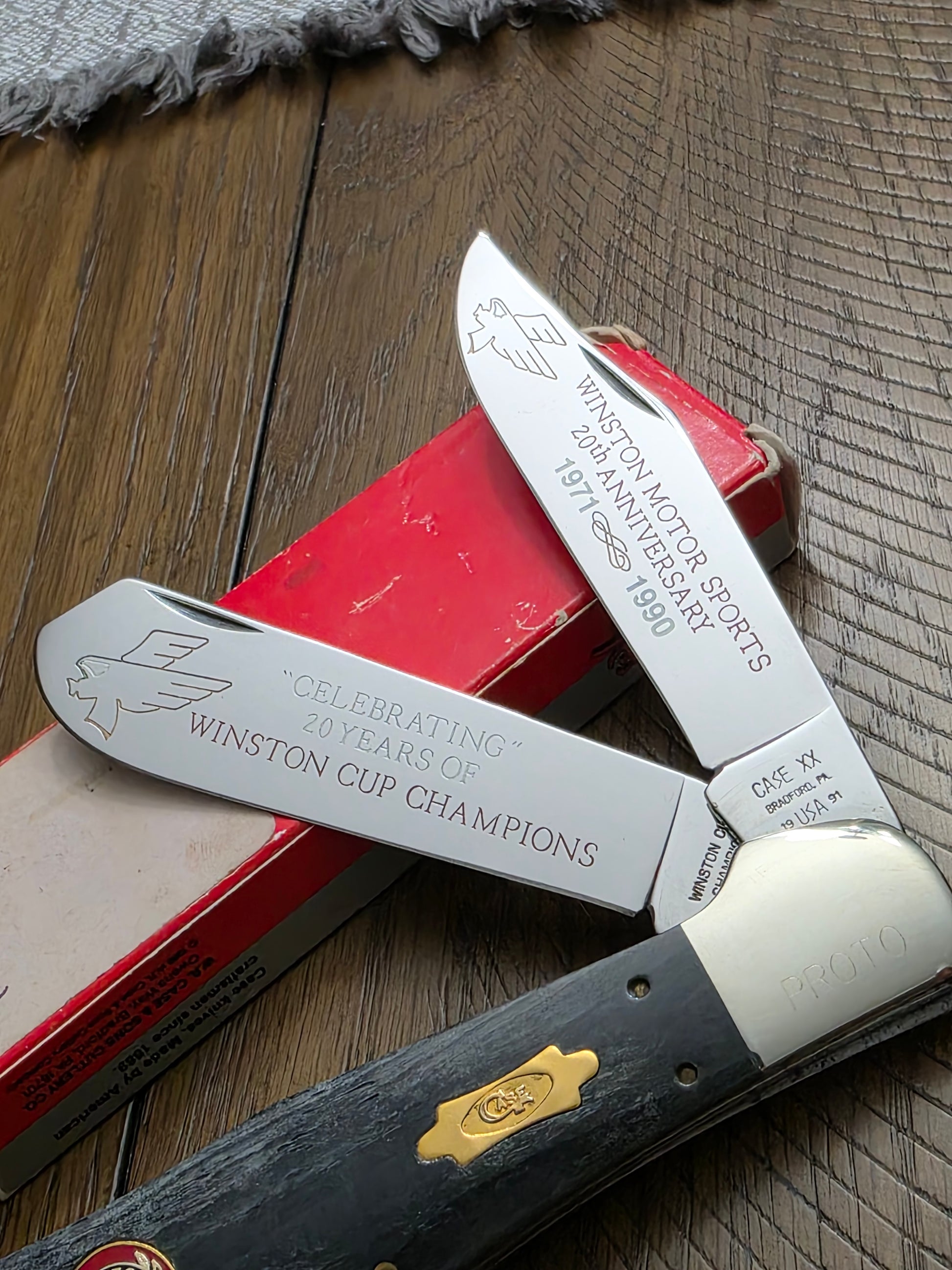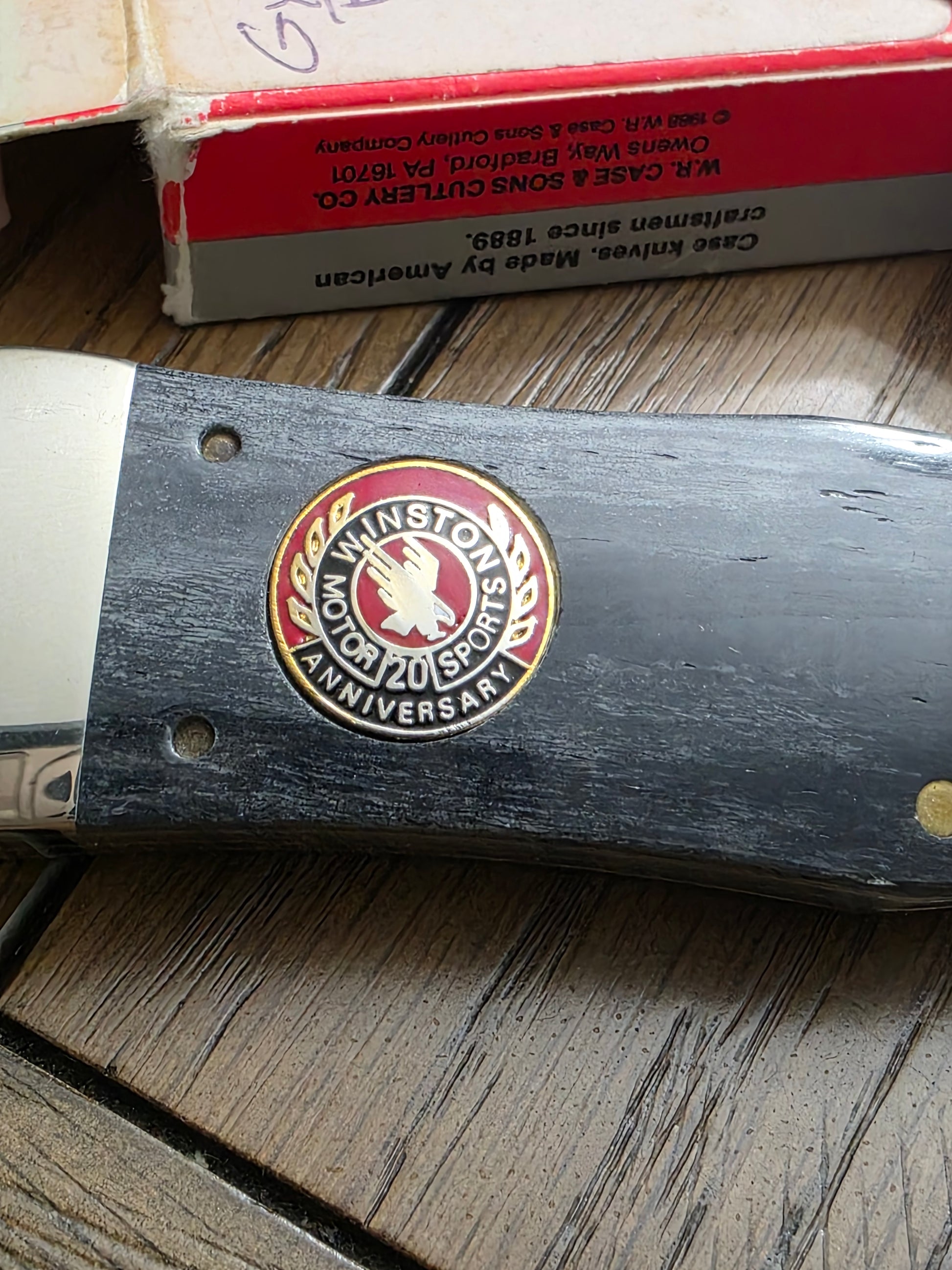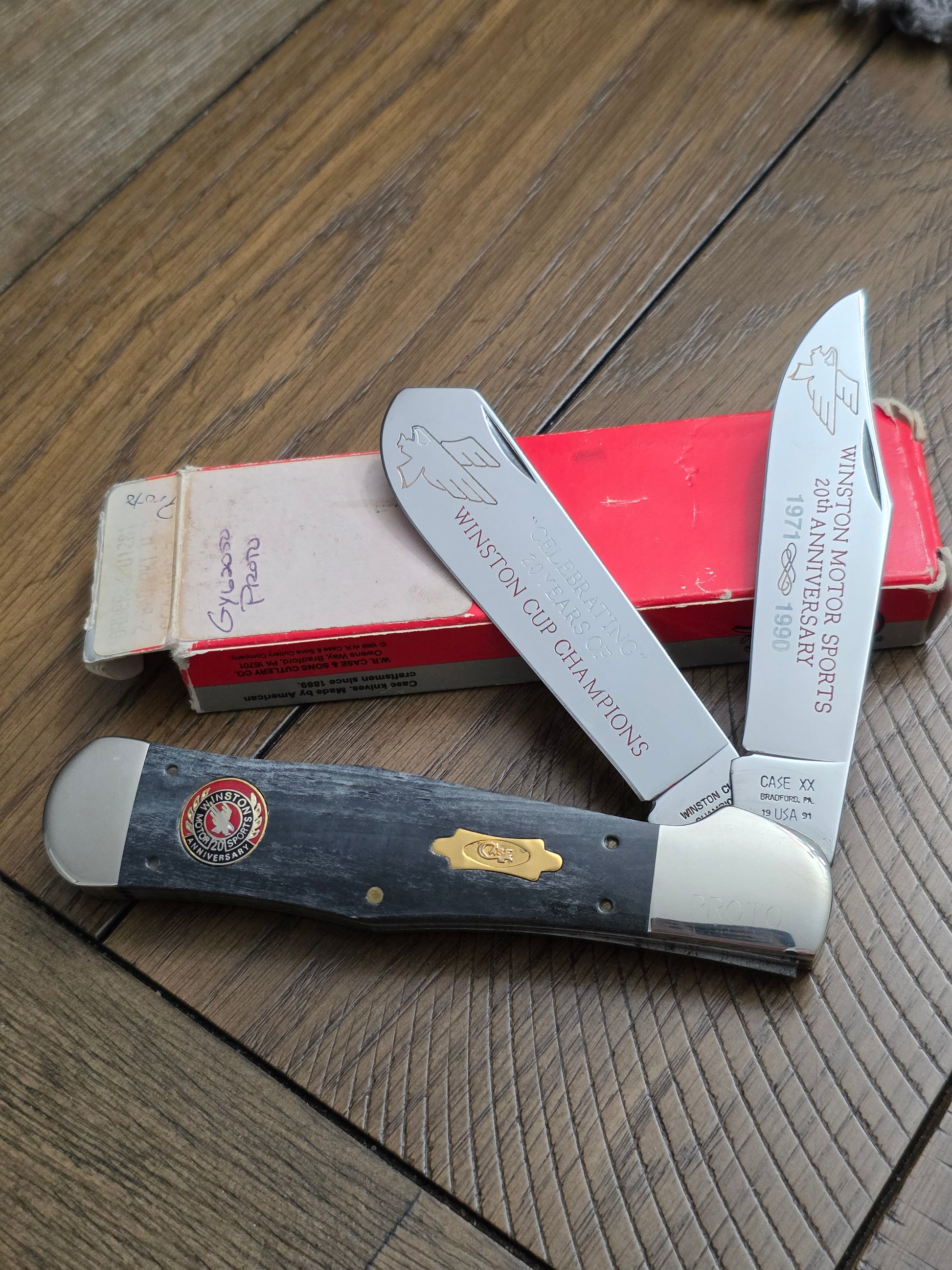 This is an odd case XX classic pattern. Kind of a mix between a coke bottle and a trapper. This is a proto type for the 20th Winston Cup Anniversary. The knife is new in box and never used.