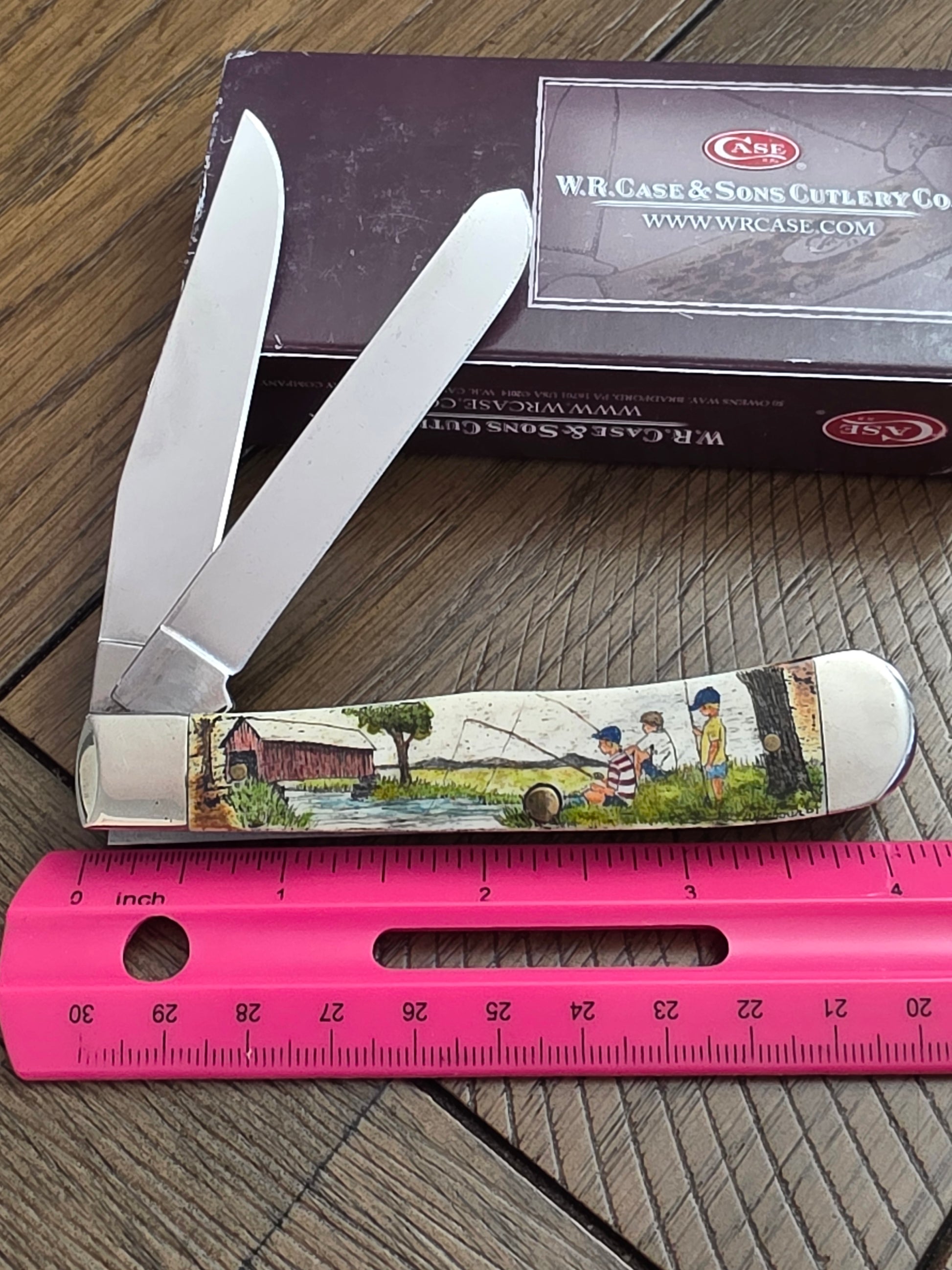 This is a Bonestag Trapper scimshaw made by Gary Harbour. It features a cane pole fishing scene on the reverse side of a Bonestag Trapper. This knife comes with a Case XX Felt Box.
