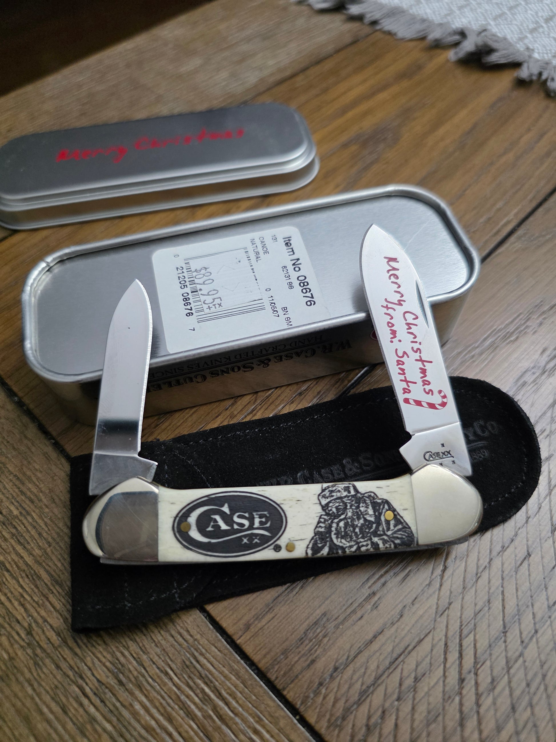 This was a Xmas knife released in 2007 by Case XX. It is a canoe natural Bone that has been engraved.