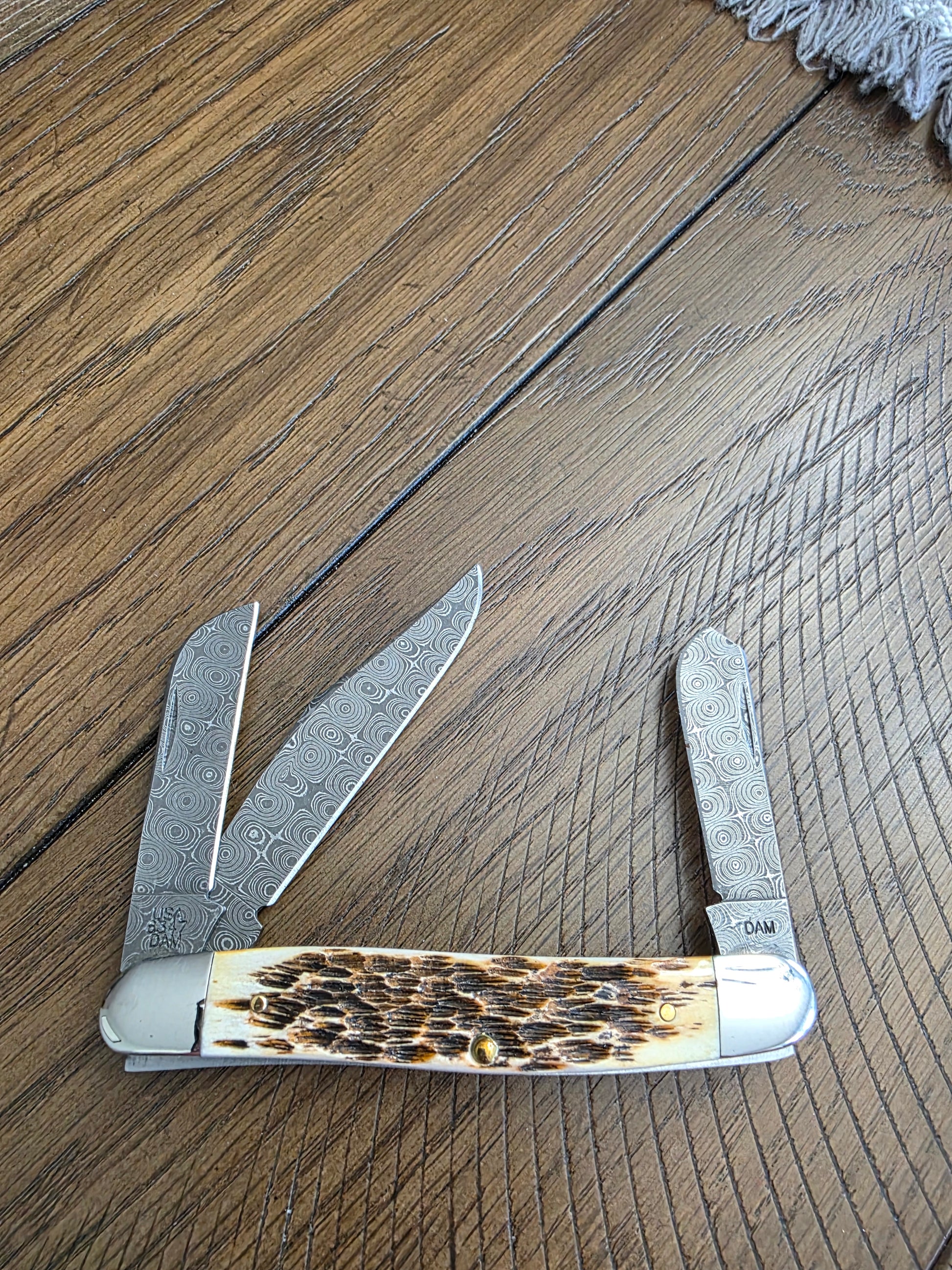 2017 Case XX Raindrop Damascus Burnt Amber Bone 6347DAM Medium Stockman