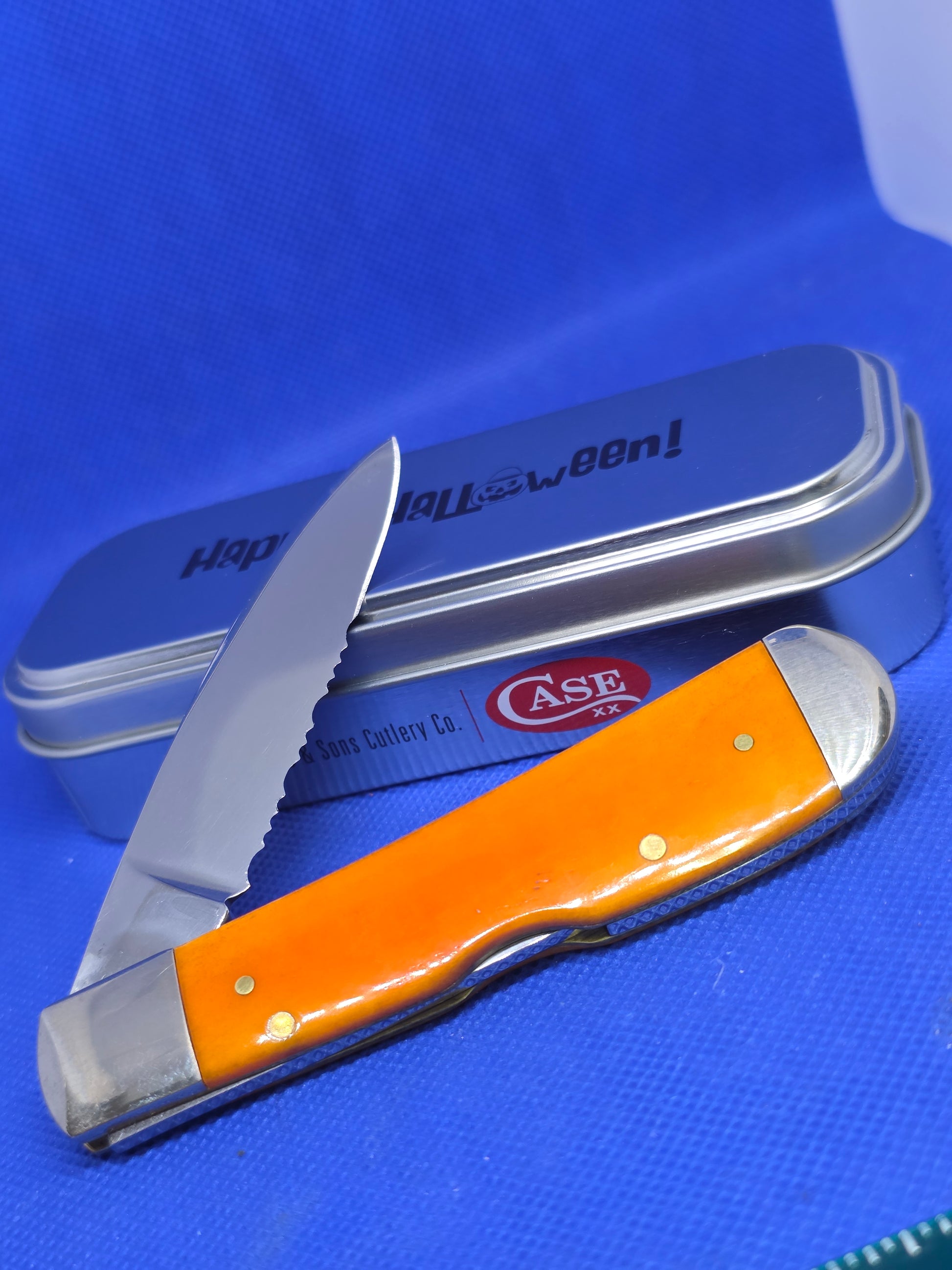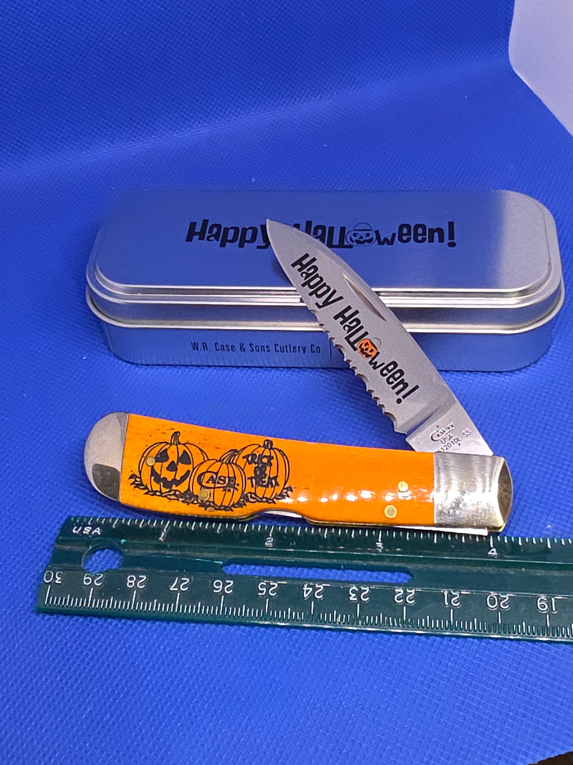 This knife is new in the original tin. Everything works as it should. It is a Tony Bose design for Case XX, it was released in 2018 for Halloween. They don't have this Pattern in production anymore. Making it very Collectible!