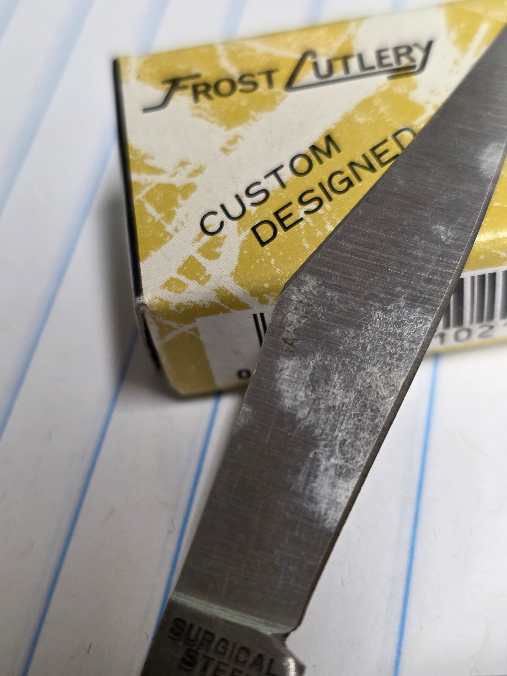 This items is in the original packaging. Never used carried or sharpened. It does have a few spots on the blades from poor storage. These spots should remove fairly easy. Japanese Steel!