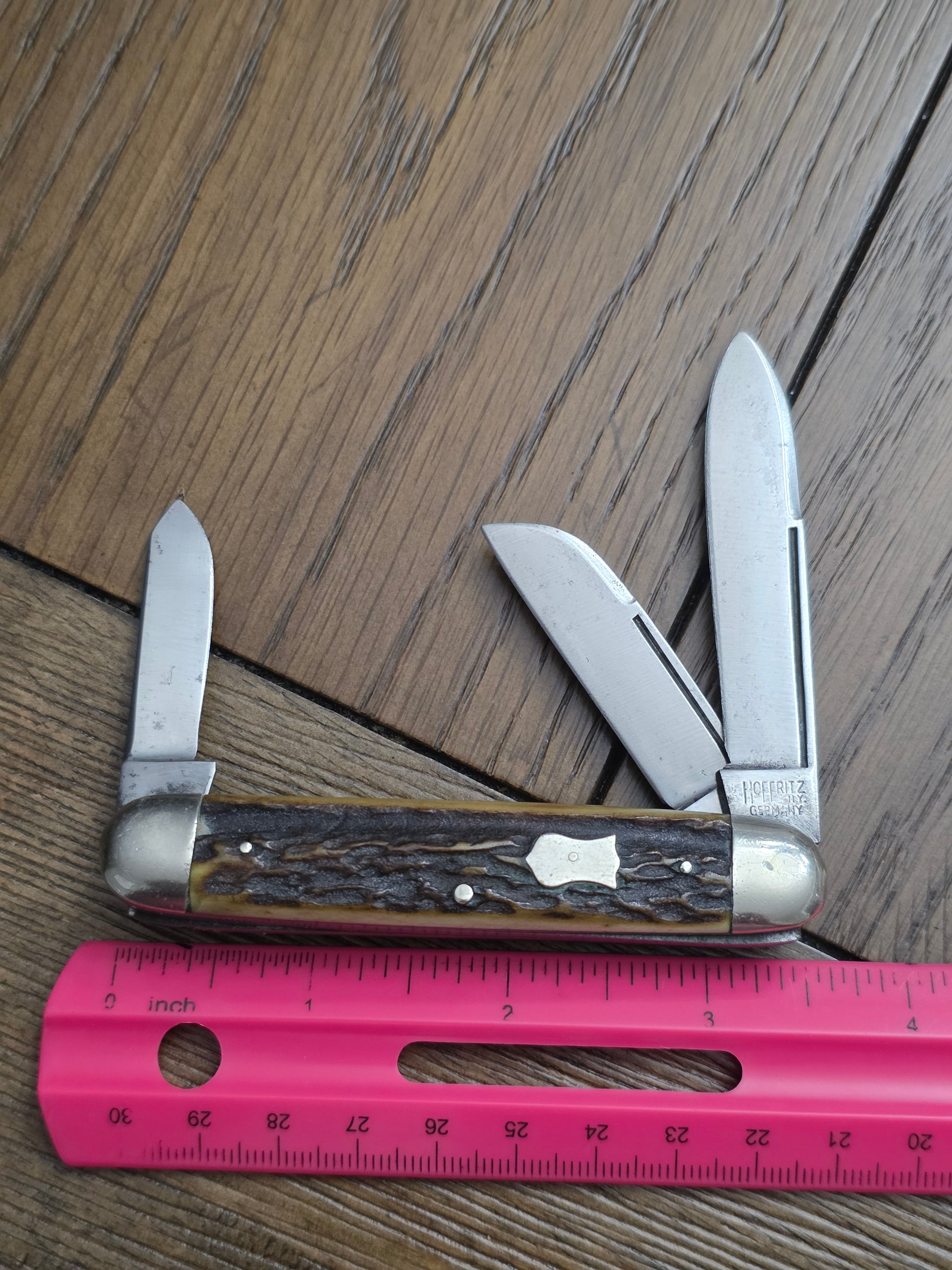 This is a very nice slightly used knife. The blades are very full, but appear to be cleaned. Also some carbon spotting on most blades. All blades open and close with good snap. Very nice stag handles.