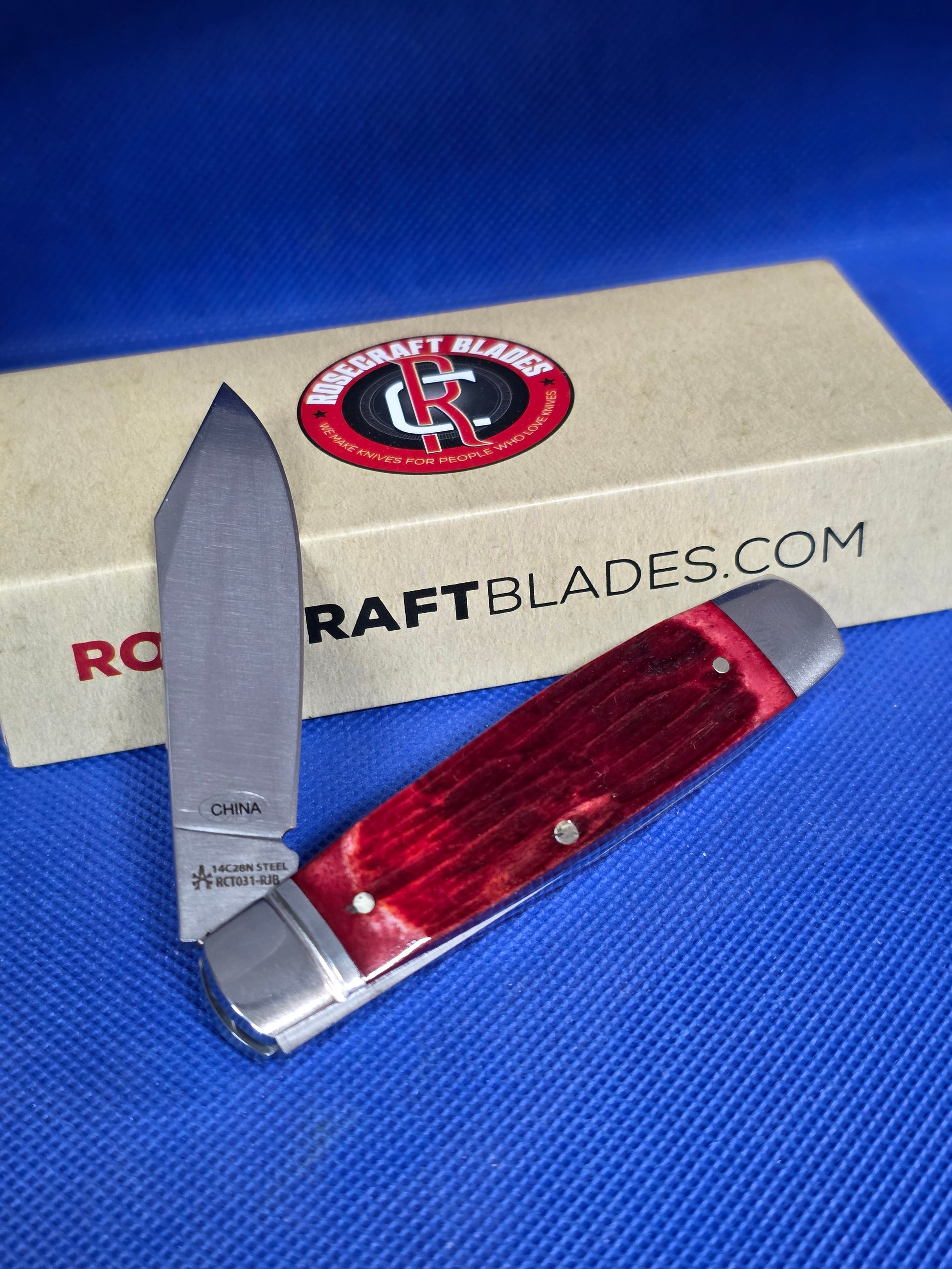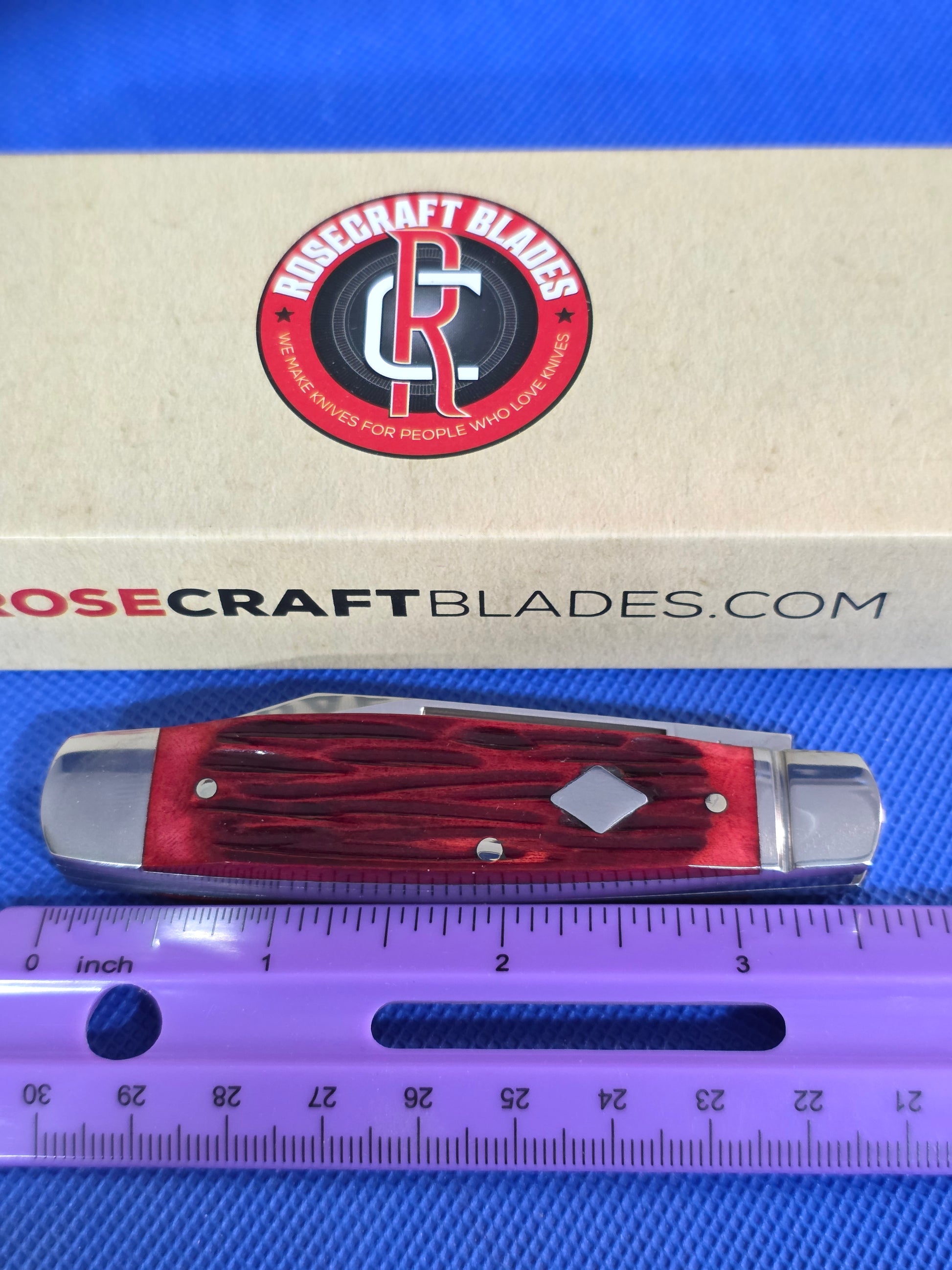 This knife is brand new in the box, features red jigged bone handles. It is the second release of 14c28n steel for the rosecraft brand. This knife is 3.625 in closed and 6.5 in overall and weighs just 3 oz. This pattern was inspired by very old non-xll pattern by Joseph Allen and sons of Sheffield England.
