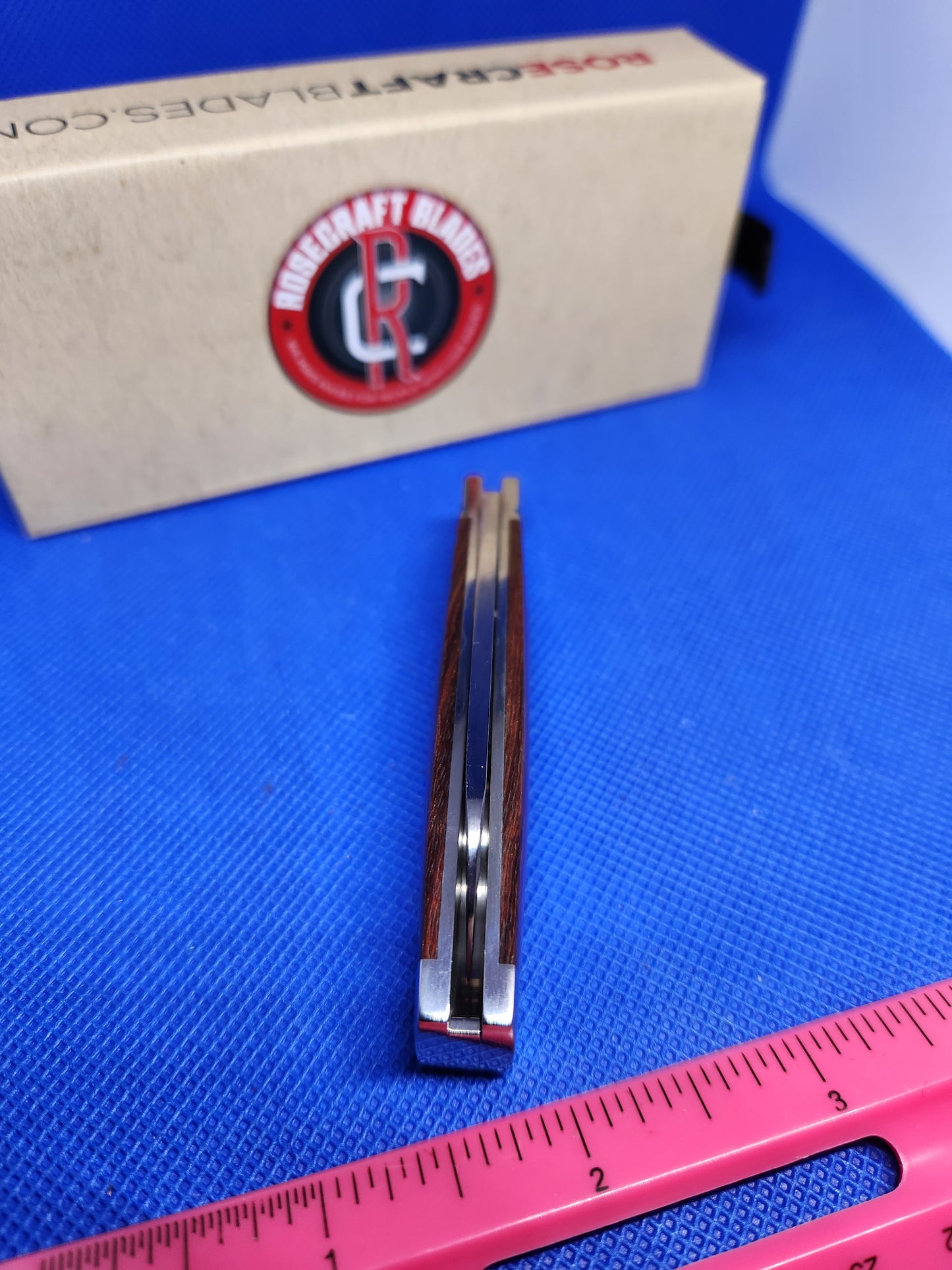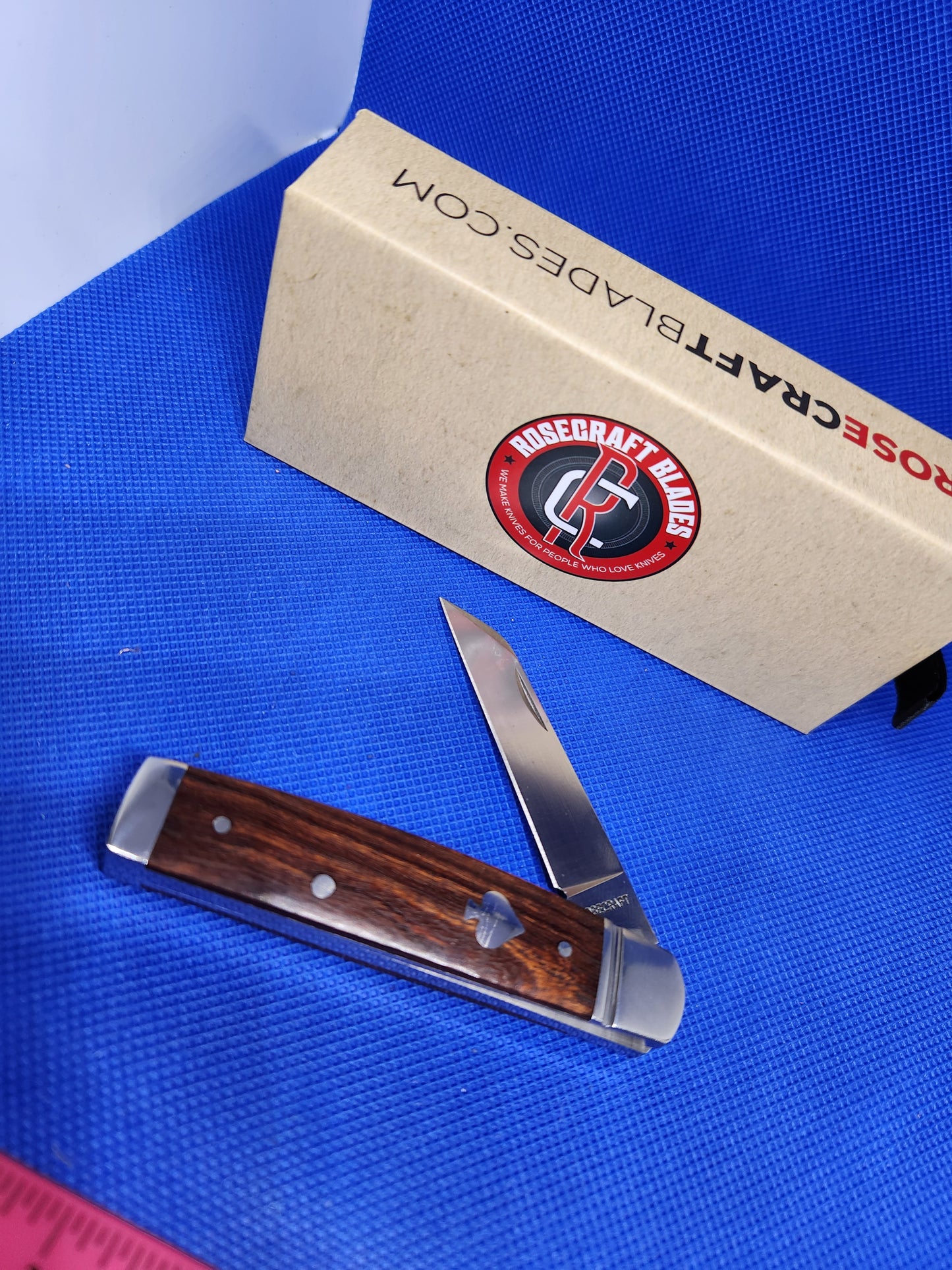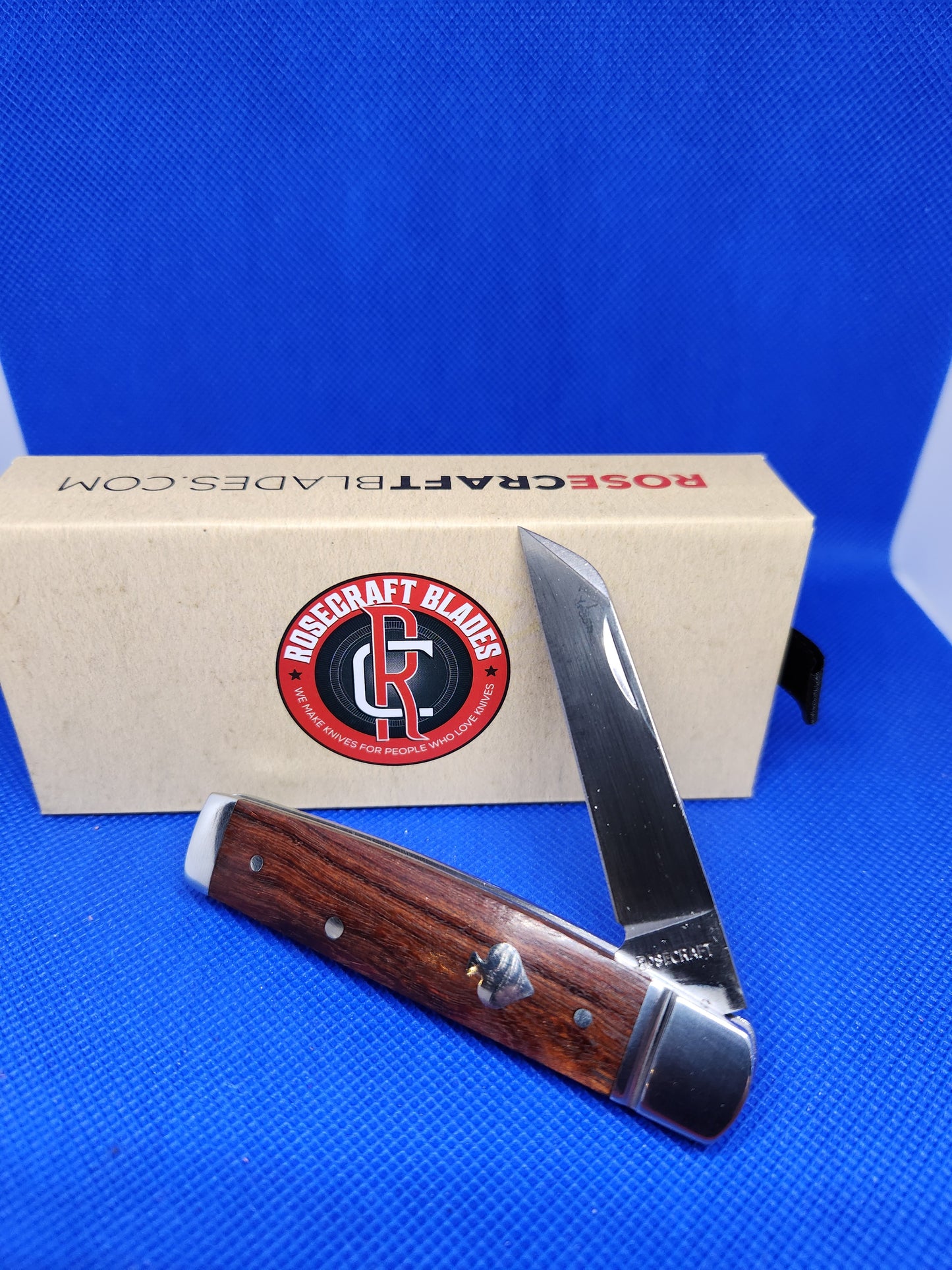 The RoseCraft Blades Sweetwater Creek Senator Red Sandalwood is a one-bladed Senator pattern that features a 2.7” D2 lambsfoot blade with a brushed satin finish, a half-stop and heavy swedging. It has genuine red sandalwood covers with brushed stainless steel bolsters, liners, and nickel silver pins. It has no shield and is 3.5” closed, 6.2” overall, and weighs just 2.4oz. This pattern was inspired by other traditional Senator patterns and re-imagined by Andy Armstrong.