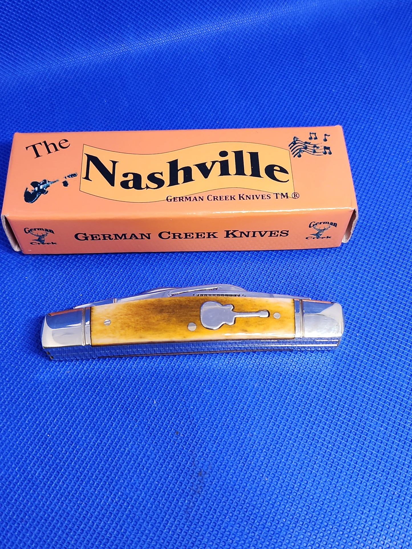 Match strike pull Introducing the Nashville Series 4 Blade Congress with beautiful Smooth Antique Bone handles. This versatile knife features four blades for all your cutting needs, as well as a guitar shield design and match strike pull. Perfect for any knife enthusiast or music lover.